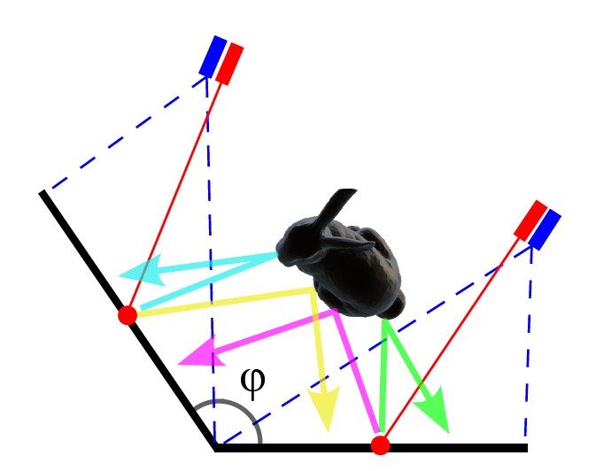 Our setup allows for analyzing the contribution of the different relay walls to the scene, that we color code in the hidden scene reconstructions. Next, we show the contribution variation depending on the angle between relay walls (only left relay wall rotates).