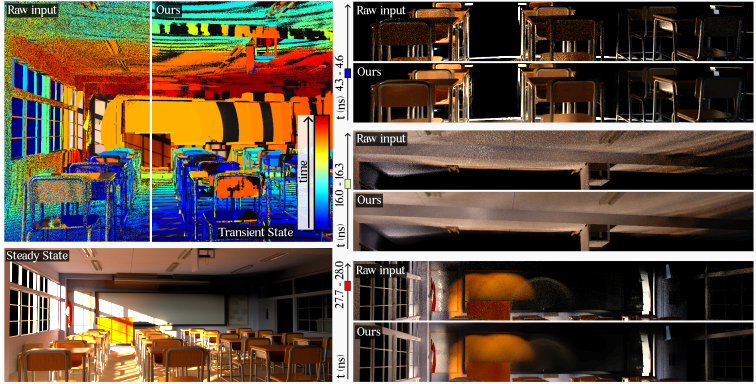 Abstract: Transient rendering simulates light in motion, measuring the time of flight from the light source to the camera. However, the stochastic nature of Monte Carlo is aggravated in transient rendering, since samples are now spread along the temporal domain. In our work, we propose to denoise transient Monte Carlo renders by exploiting the spatio-temporal correlation of transient light transport, extending a recent statistical denoising formulation. By relying on statistics, we achieve a near-optimal trade-off between reduced variance and introduced bias. We efficiently collect per-time-bin statistics in the temporal domain while avoiding impractical memory requirements, and use these collected statistics to analyze the spatio-temporal correlation and discriminate which time bins should be combined. Our statistics-based transient denoiser does not hallucinate, guarantees convergence of the result, is efficient, does not require any training and naturally handles participating media. We believe that the generality of our method might pave the way for denoising time-resolved Monte Carlo simulations in other domains, such as non-line-of-sight imaging, acoustic rendering, or absorption microscopy.