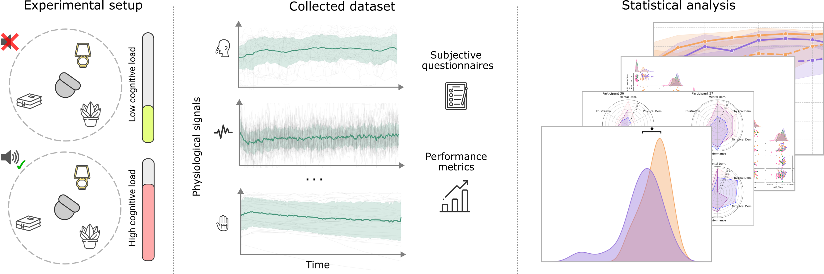 Abstract: The study of cognitive load (CL) has been an active field of research across disciplines such as psychology, education, and computer graphics and visualization for decades. In the context of Virtual Reality (VR), understanding mental demand becomes particularly relevant, as immersive experiences increasingly integrate multisensory stimuli that require users to distribute their limited cognitive resources. In this work, we investigate the effects of cognitive load during a search task in VR, combining objective and subjective measurements, including physiological signals and validated questionnaires. We designed an experiment in which participants performed a visual search task under two cognitive load conditions (either alone or while responding to a concurrent auditory task) and across two visual search areas (90° and 360°). We collected a rich dataset comprising task performance, eye tracking, electrocardiogram (ECG), electrodermal activity (EDA), photoplethysmography (PPG), and inertial measurements, along with subjective assessments (NASA-TLX questionnaires). Our analysis shows that increased cognitive load hinders visual search performance and affects multiple physiological markers, offering a solid foundation for future research on cognitive load in multisensory virtual environments.