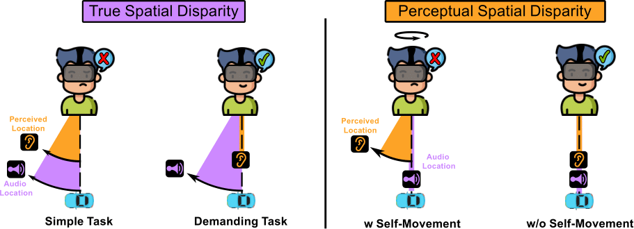 Abstract: Virtual reality (VR) experiences often leverage rich and spatialized multimodal environments to increase immersion and engagement. This demands a consistent spatial perception of audiovisual stimuli, since perceived discrepancies can disrupt the sense of presence. In this work, we investigate the consequences of two types of spatial audiovisual disparities: true disparity, where there is a measurable spatial offset between auditory and visual cues, and perceptual disparity, where users report misalignment despite cues being colocated. Unlike most previous studies that employed controlled but simplified experimental setups, our research focuses on complex, realistic VR environments, allowing us to assess the actual implications for VR content design. Our experiments indicate that users are highly sensitive to true audiovisual disparities in controlled environments, detecting even minor misalignments. However, when engaged in additional tasks within realistic settings, their ability to notice such discrepancies diminishes significantly. We also observed that previously found perceptual disparities persist in complex audiovisual environments. However, we identify self-initiated head rotations as a key factor; its absence prevents the effect entirely. We hope our findings offer practical insights for designing more immersive and perceptually coherent VR experiences.